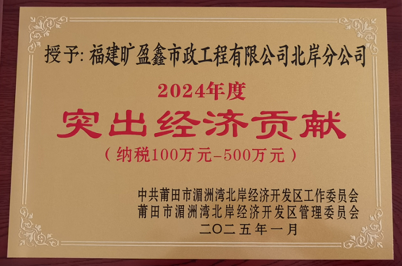 2025年1月 福建曠盈鑫市政工程有限公司北岸分公司被中共莆田市湄洲灣北岸經(jīng)濟(jì)開發(fā)區(qū)工作委員會、莆田市湄洲灣北岸經(jīng)濟(jì)開發(fā)區(qū)管理委員會授予“2024年度突出經(jīng)濟(jì)貢獻(xiàn)(納稅100萬元-500萬元)”榮譽(yù)
