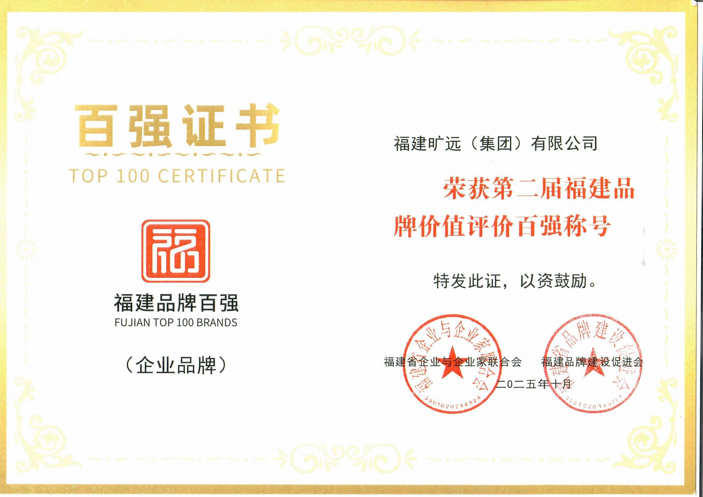 2025年10月 福建曠遠(yuǎn)(集團(tuán))有限公司榮獲“第二屆福建品牌價值評價百強(qiáng)”稱號第37位
